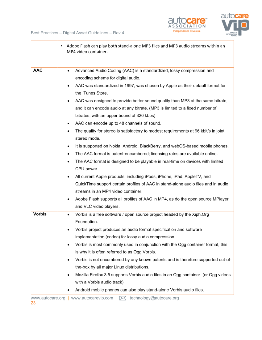 Best Practices – Digital Asset Guidelines – Rev 4 www.autocare.org | www.autocarevip.com | technology@autocare.org 23 • Adobe Flash can play both stand-alone MP3 files and MP3 audio streams within an MP4 video container. AAC • Advanced Audio Coding (AAC) is a standardized, lossy compression and encoding scheme for digital audio. • AAC was standardized in 1997, was chosen by Apple as their default format for the iTunes Store. • AAC was designed to provide better sound quality than MP3 at the same bitrate, and it can encode audio at any bitrate. (MP3 is limited to a fixed number of bitrates, with an upper bound of 320 kbps) • AAC can encode up to 48 channels of sound. • The quality for stereo is satisfactory to modest requirements at 96 kbit/s in joint stereo mode. • It is supported on Nokia, Android, BlackBerry, and webOS-based mobile phones. • The AAC format is patent-encumbered licensing rates are available online. • The AAC format is designed to be playable in real-time on devices with limited CPU power. • All current Apple products, including iPods, iPhone, iPad, AppleTV, and QuickTime support certain profiles of AAC in stand-alone audio files and in audio streams in an MP4 video container. • Adobe Flash supports all profiles of AAC in MP4, as do the open source MPlayer and VLC video players. Vorbis • Vorbis is a free software / open source project headed by the Xiph.Org Foundation. • Vorbis project produces an audio format specification and software implementation (codec) for lossy audio compression. • Vorbis is most commonly used in conjunction with the Ogg container format, this is why it is often referred to as Ogg Vorbis. • Vorbis is not encumbered by any known patents and is therefore supported out-of- the-box by all major Linux distributions. • Mozilla Firefox 3.5 supports Vorbis audio files in an Ogg container. (or Ogg videos with a Vorbis audio track) • Android mobile phones can also play stand-alone Vorbis audio files.